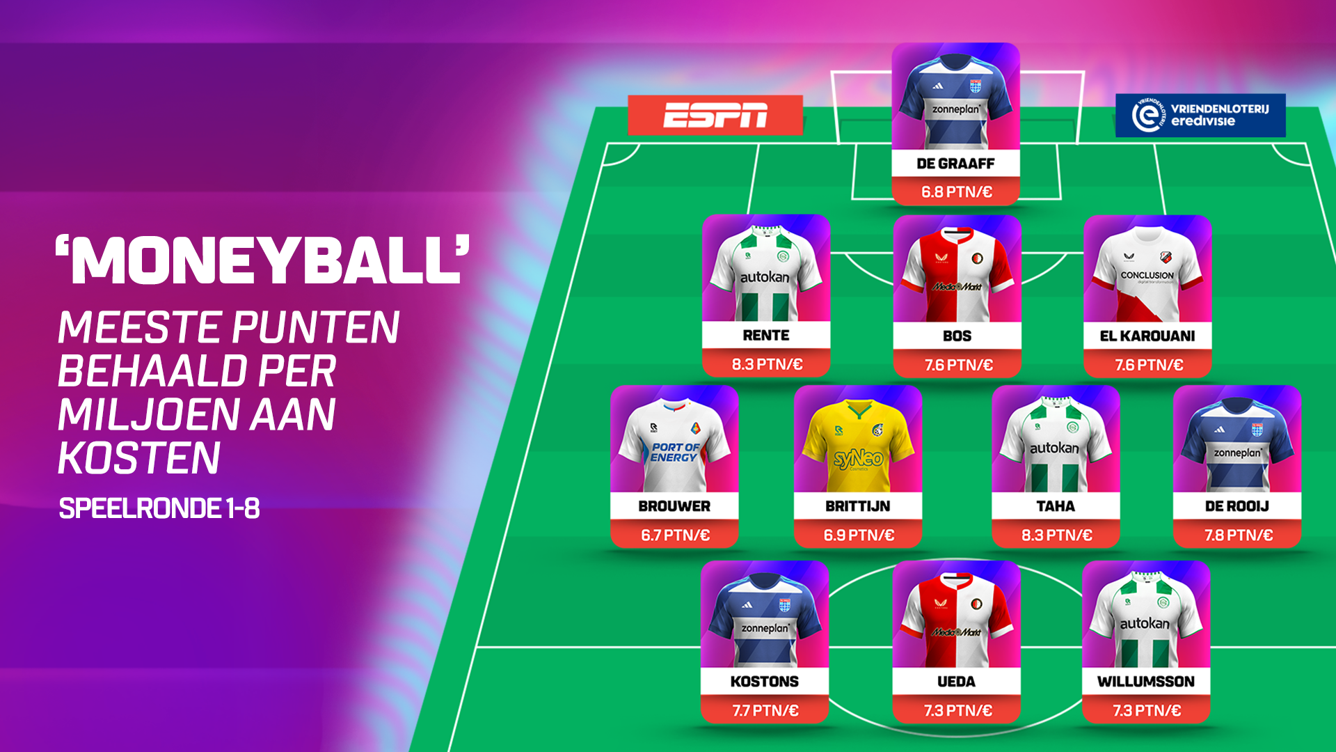 Dit Moneyball-team, gevuld met de spelers die gemiddeld de meeste Fantasy-punten per uitgegeven miljoen opleveren, kent vijf spelers die ook voorkomen in het Dreamteam. Het defensieve trio Rente-Bos-El Karouani vormt zelfs als we rekening houden met de spelersprijs het podium van uitblinkende verdedigers. Daarnaast zien we budget-spits Kostons wederom voorin vergezeld worden door Ueda, de enige speler van meer dan 7 miljoen in dit team.