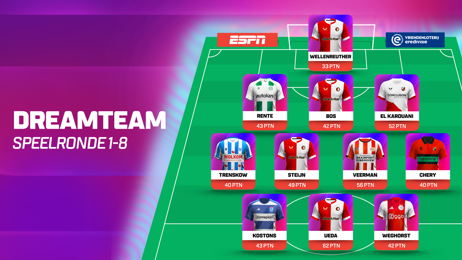 Allereerst is er natuurlijk de flinke voetafdruk van de koploper. Doordat Feyenoord in liefst vijf van zijn eerste acht competitieduels de nul hield zien we zowel Timon Wellenreuther (5.5M) als Jordan Bos (5.5M) als afgevaardigde uit de sterke Rotterdamse defensie. Topscorer Ayase Ueda (8.5M) is met 62 Fantasy-punten niet geheel onverwacht de productiefste speler in het spel. Maar dat de meest gekozen speler, Sem Steijn (11.1M), ‘gewoon’ het Dreamteam haalt, is opvallend na enig gemor over zijn start.