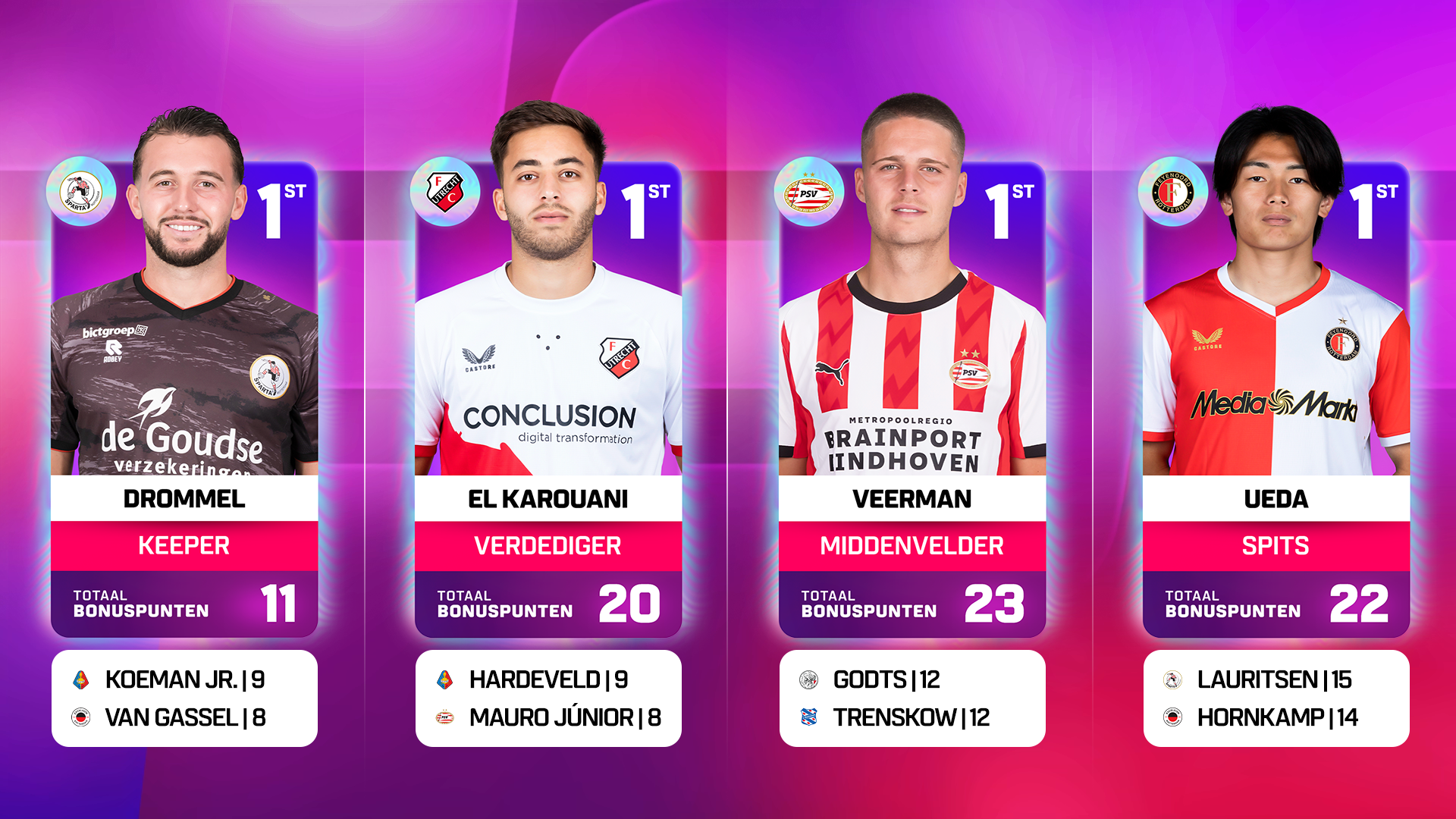 Maar Ueda’s voorsprong op het bonus-front is niet enorm. Zo bereiken Tobias Lauritsen (6.9M), Jizz Hornkamp (6.3M), Ricky van Wolfswinkel (5.9), Koki Ogawa (6.2), Kento Shiogai (4.8M) en Koen Kostons (5.9M) allemaal ook al de dubbele cijfers qua behaalde bonuspunten. Dit omdat beslissende doelpunten zwaar wegen in het algoritme.
